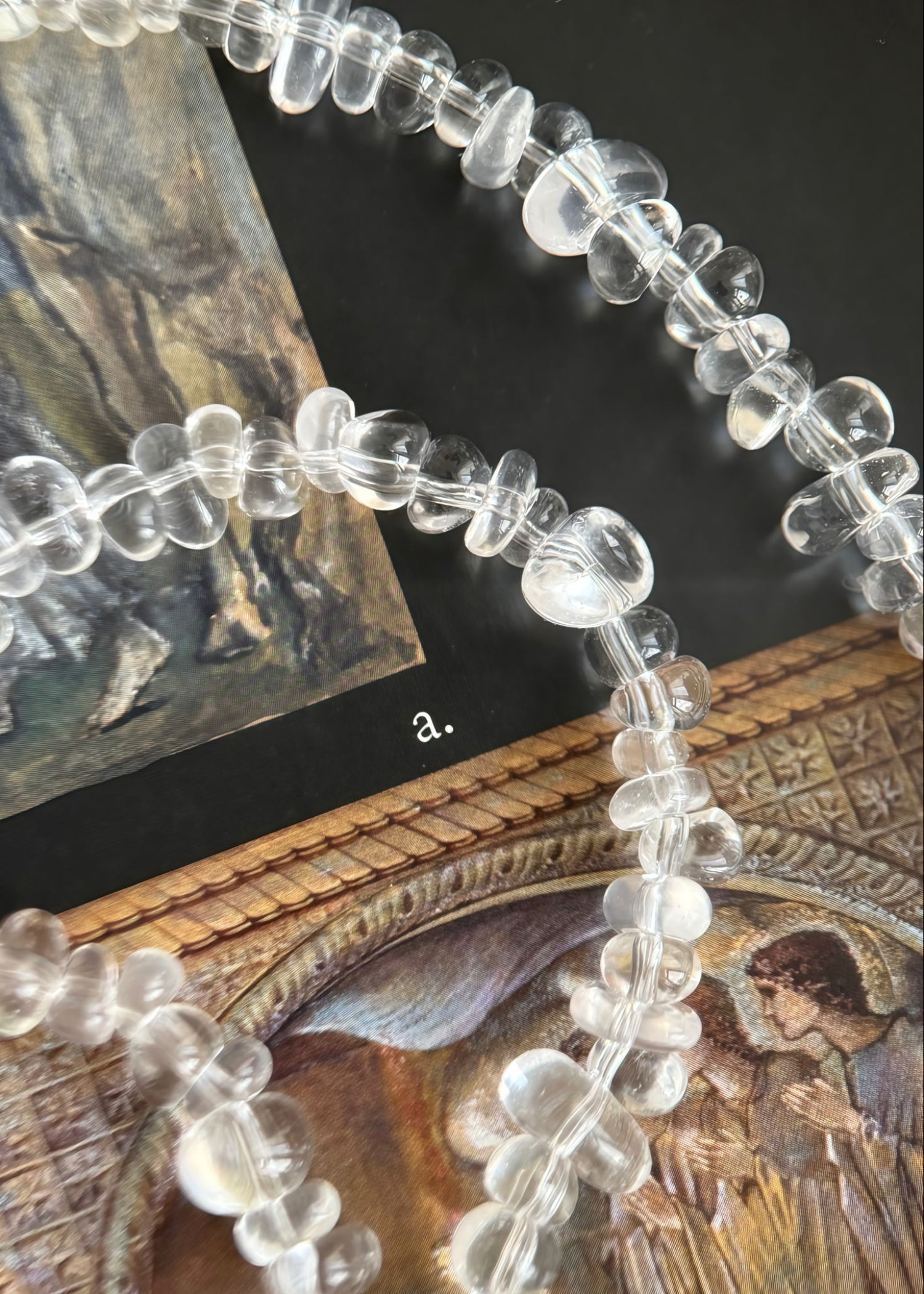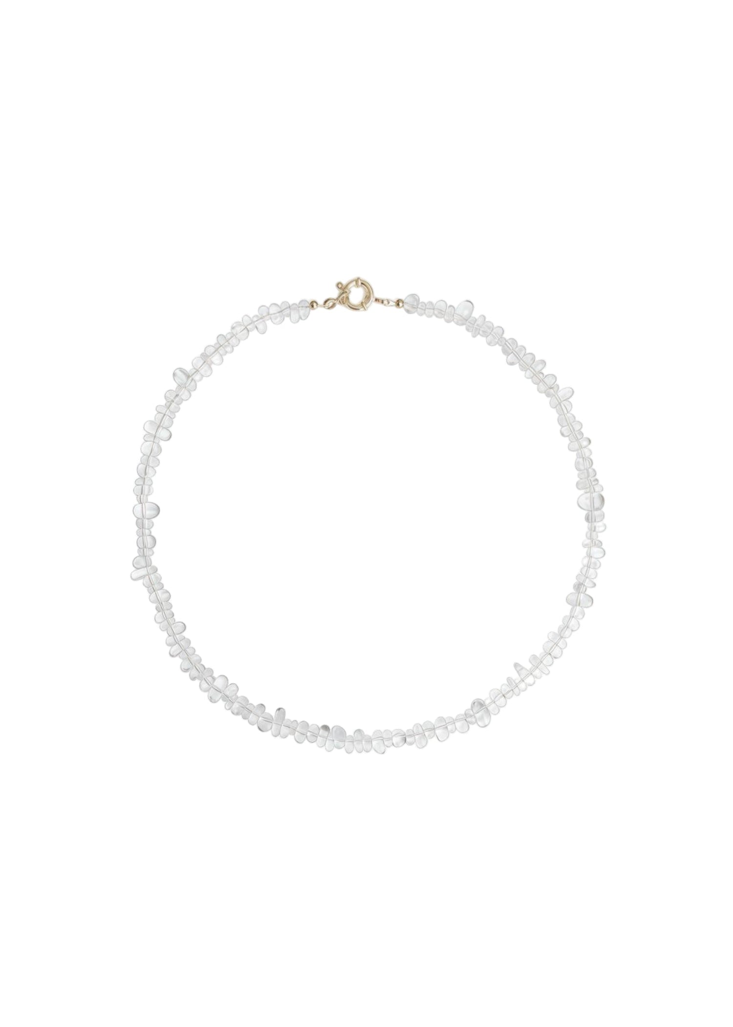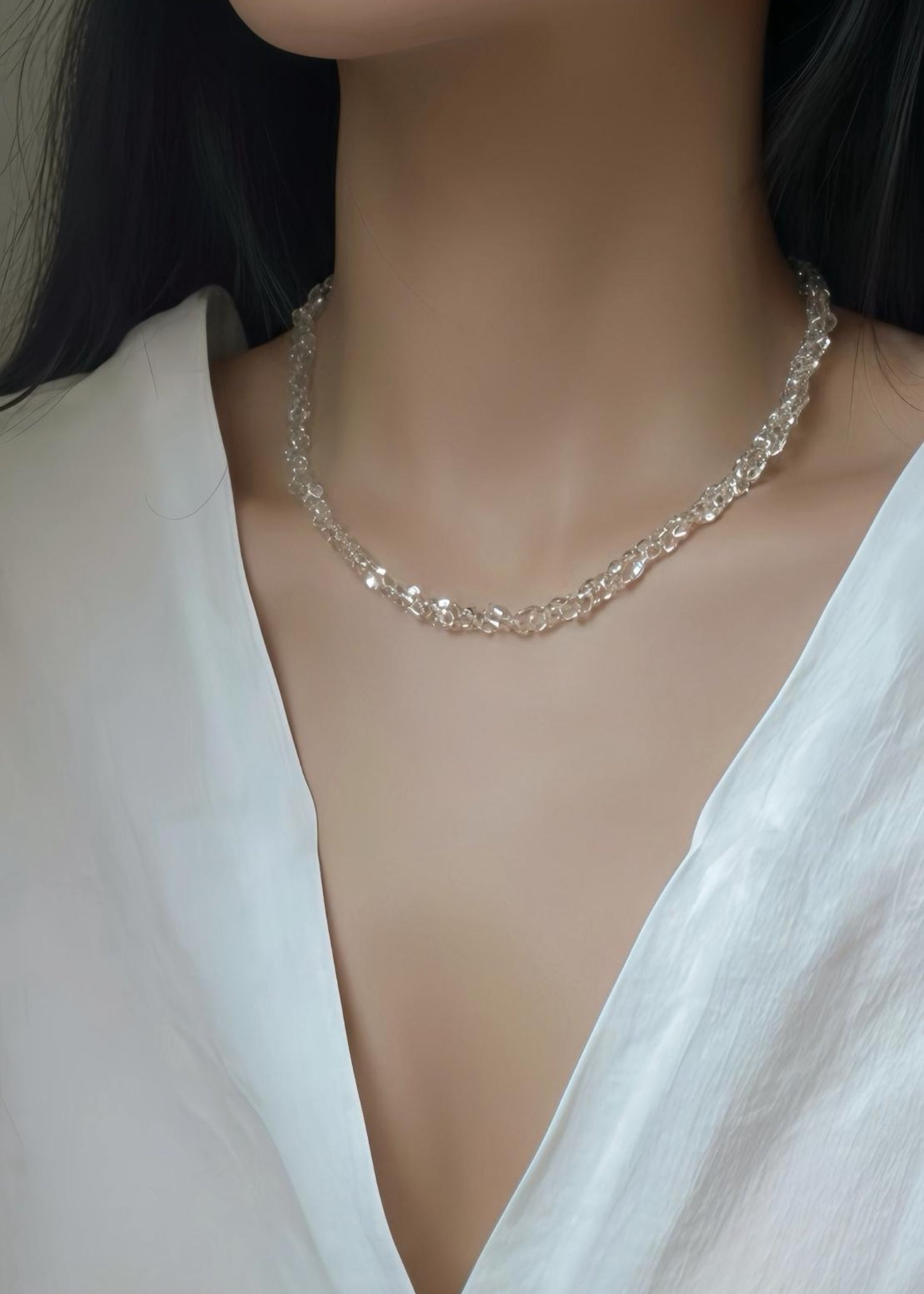 Ein Paradebeispiel feinster Handwerkskunst — eine handpolierte Halskette aus klarem, weißem Kristall mit perfekt glatten, feinen Kanten.