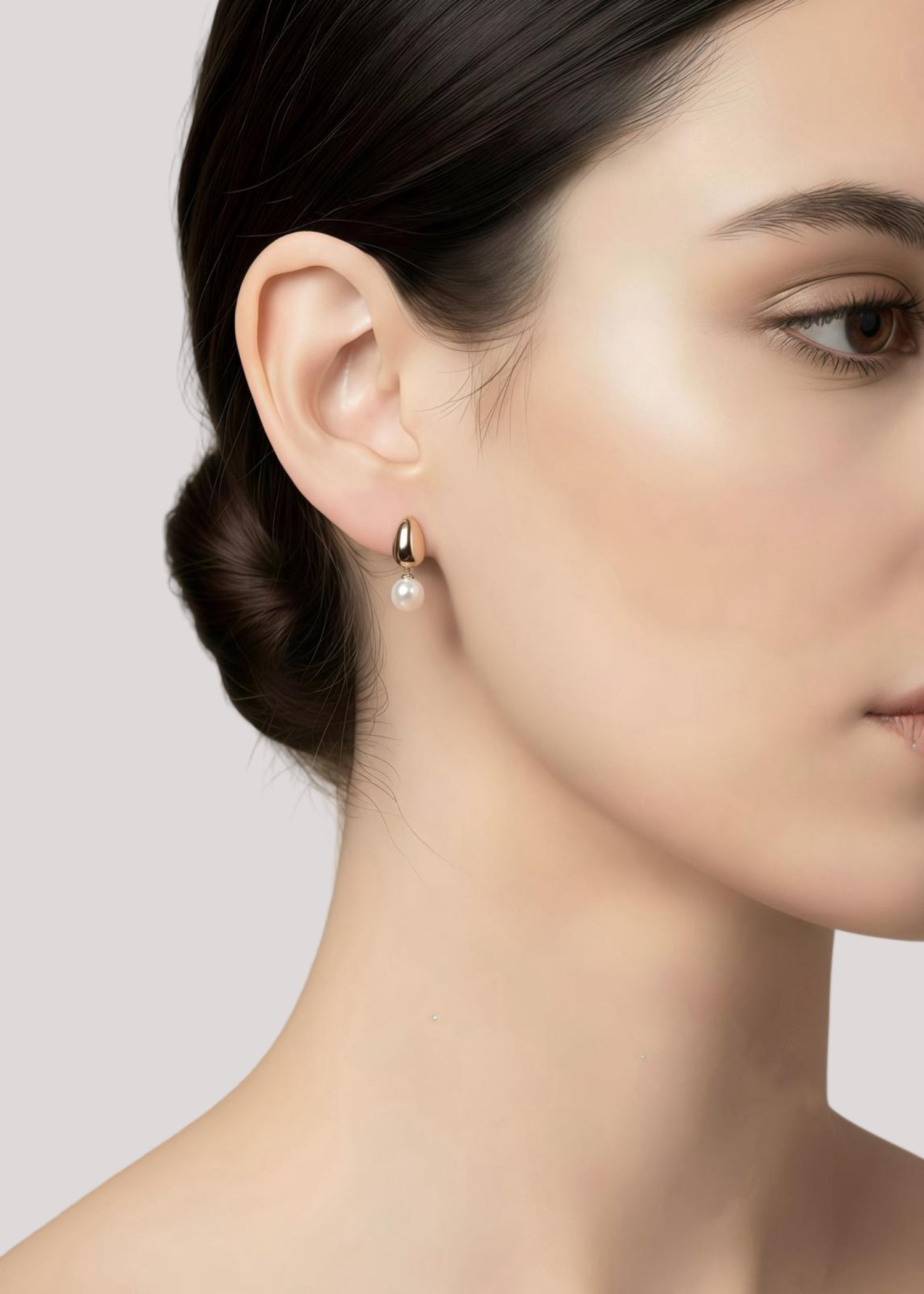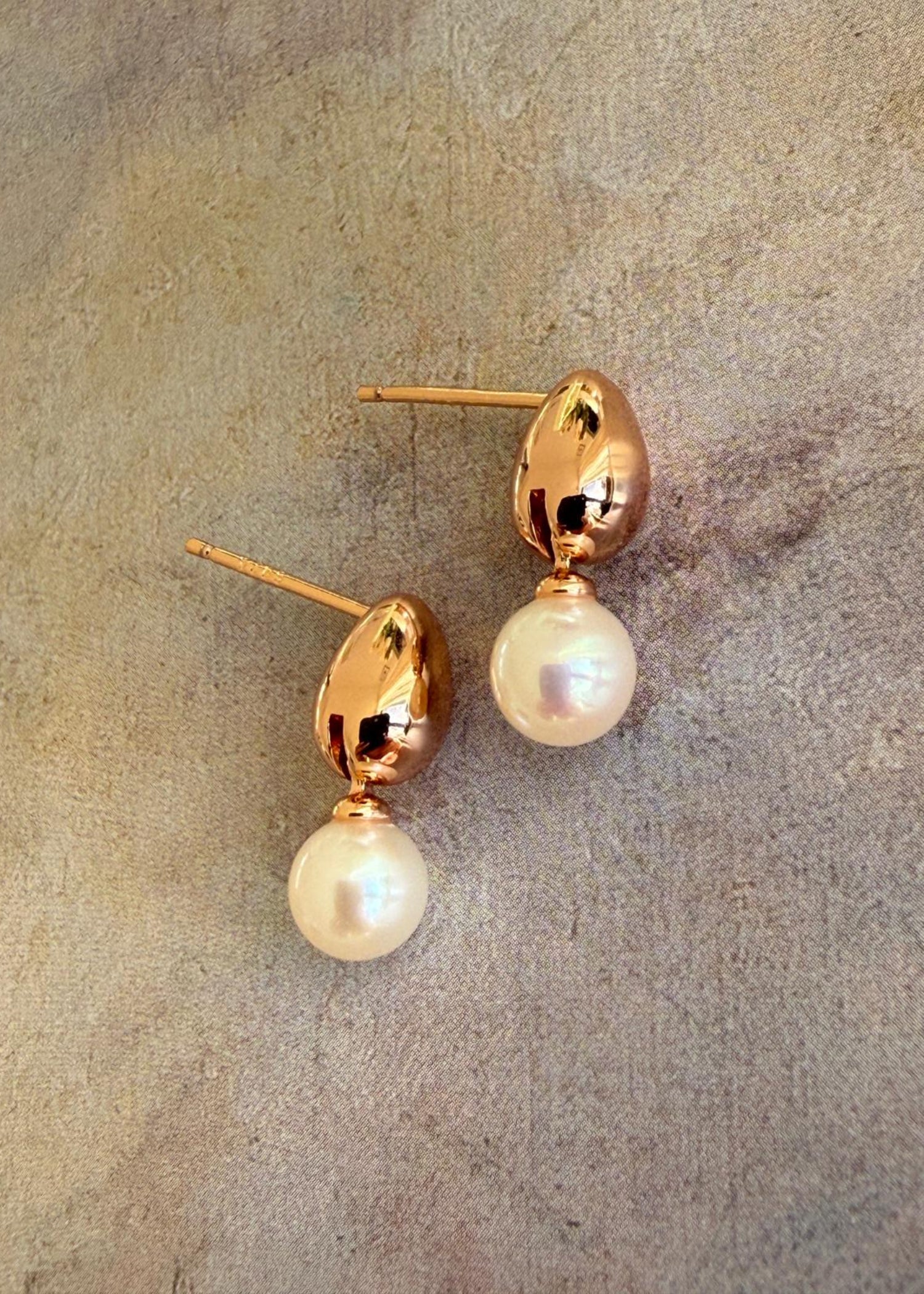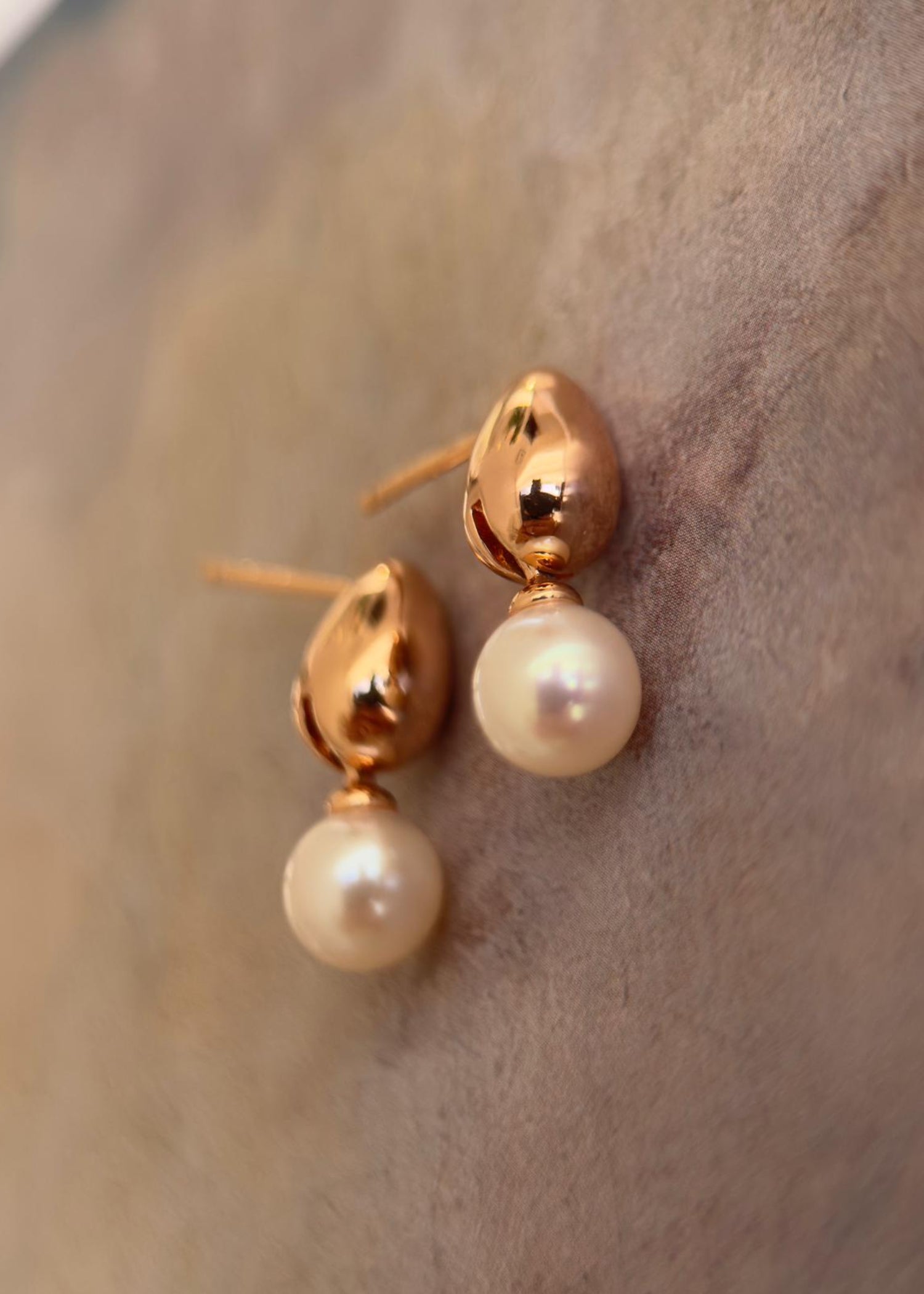 Goldene Ohrringe in Tropfenform mit einer glänzenden Perle, die sanft darunter schwingt.